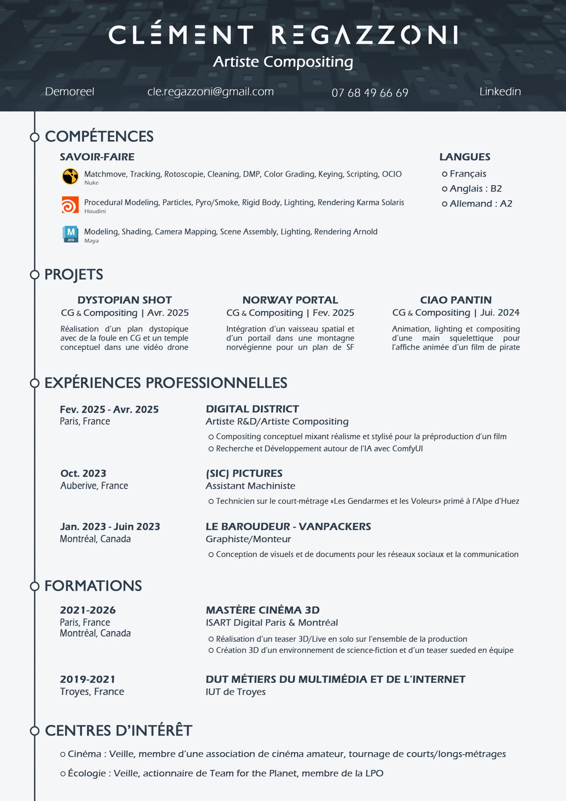 Je m’appelle Clément REGAZZONI, j’ai 23 ans et je suis depuis septembre 2021 étudiant à ISART Digital. Aujourd’hui à Paris pour achever mon master cinéma 3D (actuellement en quatrième année), j’ai décidé de faire la deuxième année de mon cursus à Montréal afin de vivre une nouvelle expérience et d’évoluer dans une ville réputée pour son activité dans le monde des effets spéciaux et du cinéma d’animation. Avant cela, j’ai été diplômé d’un DUT Métiers du Multimédia et de l’Internet que j’ai suivi à l’IUT de Troyes.